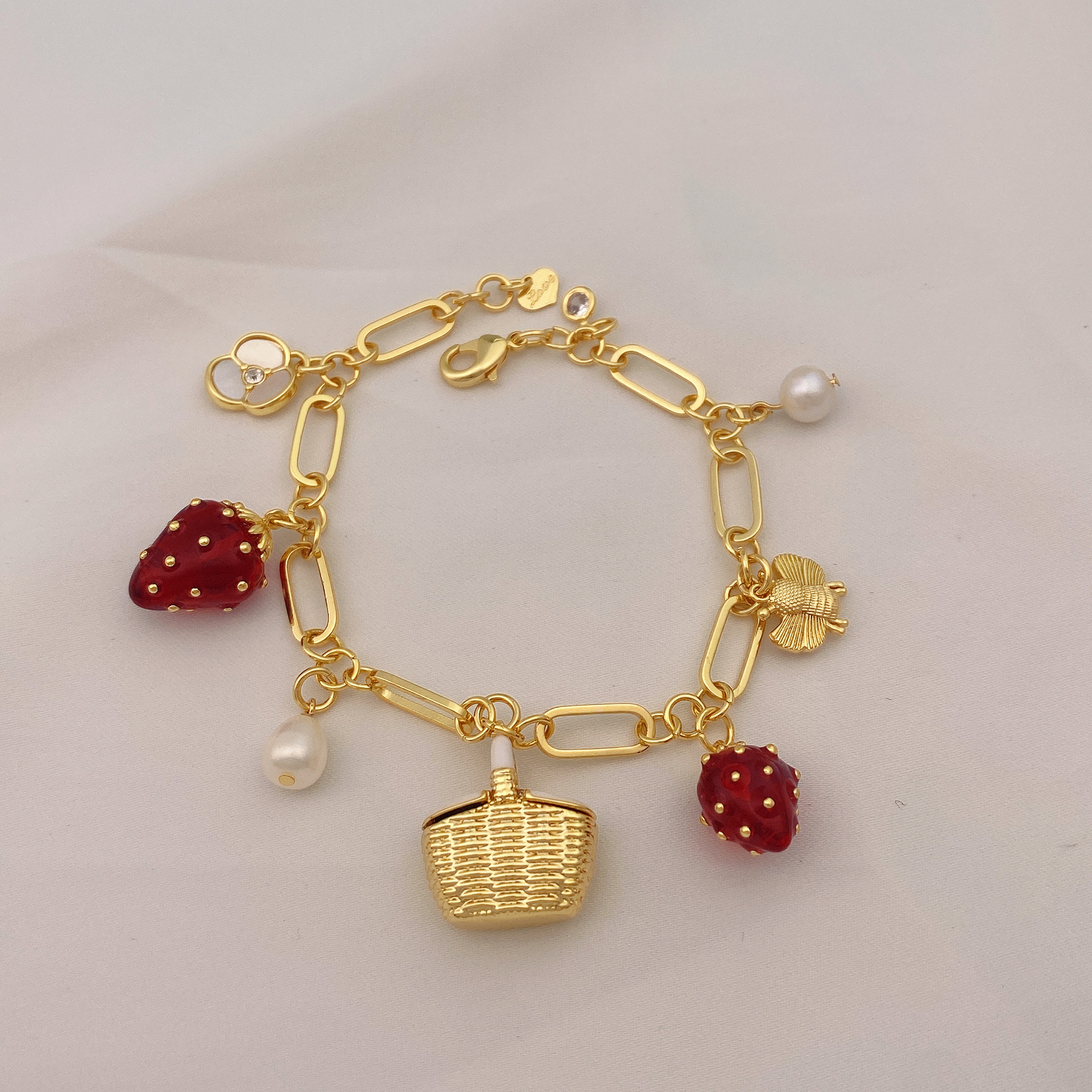 2024 New Sweet Pastoral Plants Red Resin Strawberry Pearl Small Basket Bees Gem Bracelet Jewelry Women